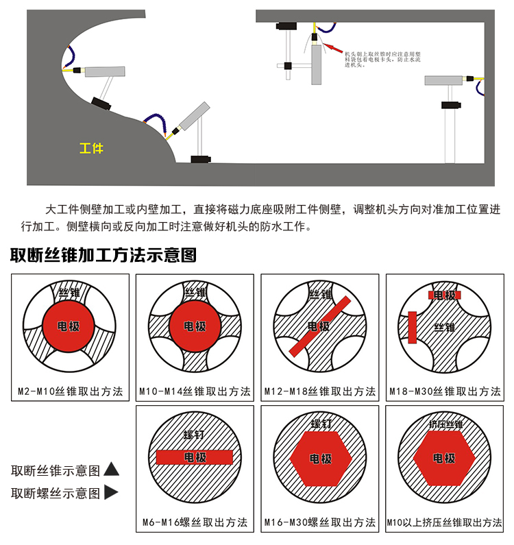 3. 配M1-M6電極,適合取M2-M20,折斷深度在40mm以內(nèi)的斷絲錐,特別是在取M10以上斷絲錐時(shí)效果明顯增快